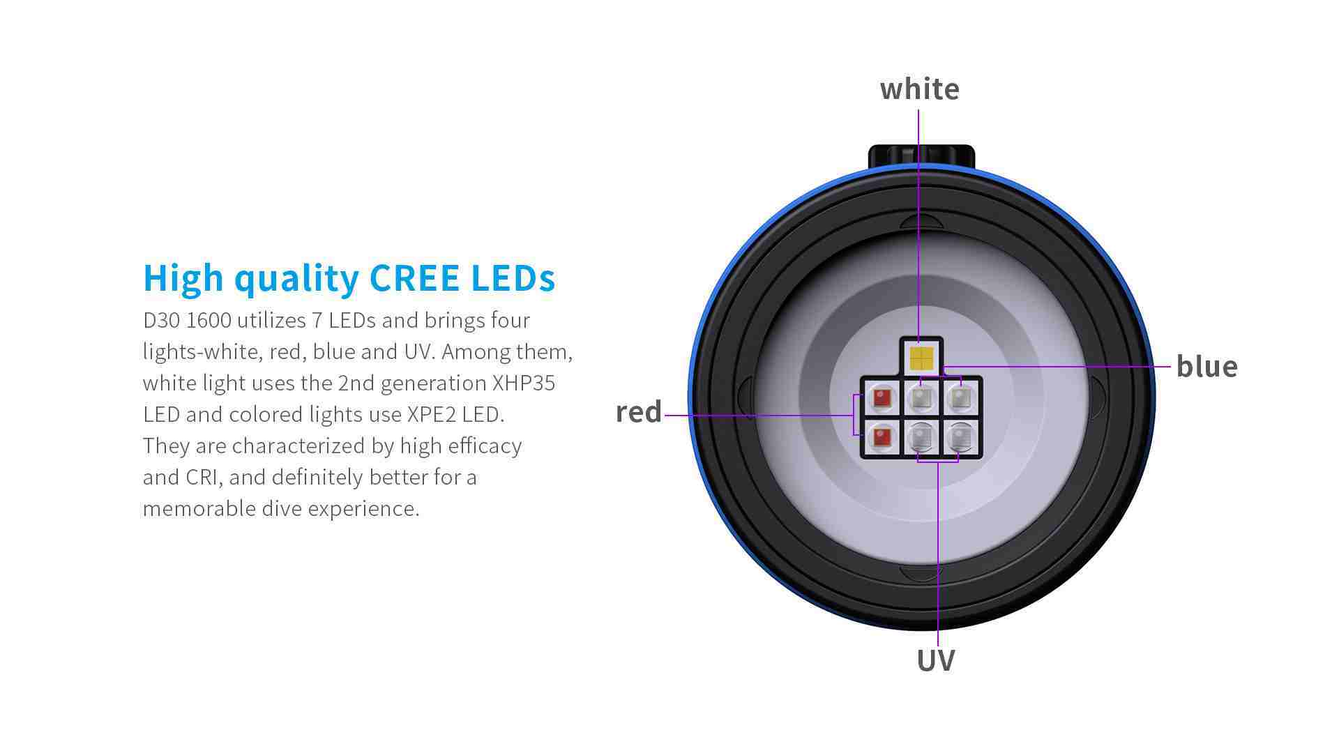 • Korkea CRI, seitsemällä Cree LEDillä - XHP35 valkoiselle valolle, XPE2 värillisille valoille.